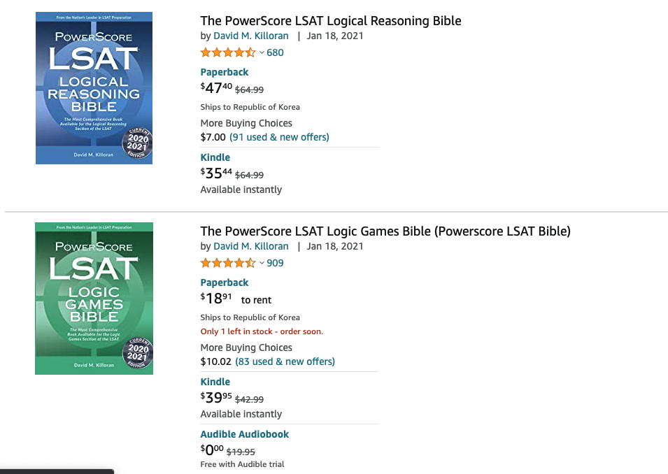제가 확고하게 추천 드리는 공부 강의, 자료, 책은 Lawhub, Powerscore Bible Series, 7sage, Loophole 그리고 LSAT Trainer입니다.